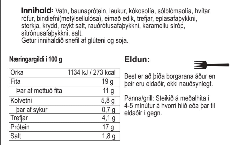 Vatn, baunaprótein, laukur, kókosolía, sólblómaolía, hvítar