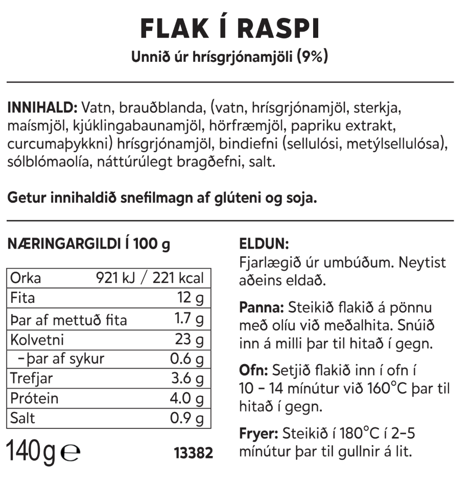 Vatn, brauðblanda, (vatn, hrísgrjónamjöl, sterkja, maísmjöl, kjúklingabaunamjöl, hörfræmjöl, papriku extrakt,