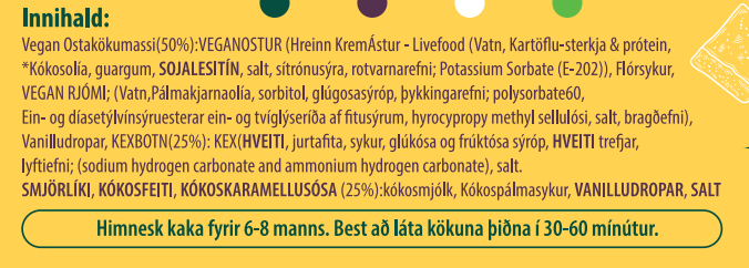 Innihald: Vegan Ostakökumassi (50%): *VEGANOSTUR; (Hreinn KremÁstur-(Livefood ehf): (Vatn, Kartöflu-sterkja&prótein,*Kókosolía,guargum,Soyja Lechitine, salt,sítrónusýra, rotvarnarefni; Potassium Sorbate (E-202)), Flórsykur, VEGAN RJÓMI;(Vatn,Pálmakjarnaolía,sobitol,glúgosasýróp, þykkingarefni; polysorbate60, Ein- og díasetýlvínsýruesterar ein- og tvíglýseríða af fitusýrum, hyrocypropy methyl sellulósi,salt, bragðefni), Vanilludropar, KEXBOTN (25%):(( KEX; ( hveiti, jurtafita (pálma), sykur, glúkósa og frúktósa sýróp, hveiti trefjar, lyftiefni; (sodium hydrogen carbonate and ammonium hydrogen carbonate), salt.))SMJÖRLÍKI: (Jurtaolíur (pálmaolía, kókosolía), sýra (E330), repjuolía, vatn, kókosolía, salt, bindiefni (E471, E322), smjörbragðefni (kanólaolía, bragðefni), litarefni (E160a)), KÓKOSFEITI, KÓKOSKARAMELLUSÓSA (25%): (Ella Stína); (kókosmjólk, niðursoðinn, Kókospálmasykur, VANILLUDROPAR, SALT, sjávarsalt)