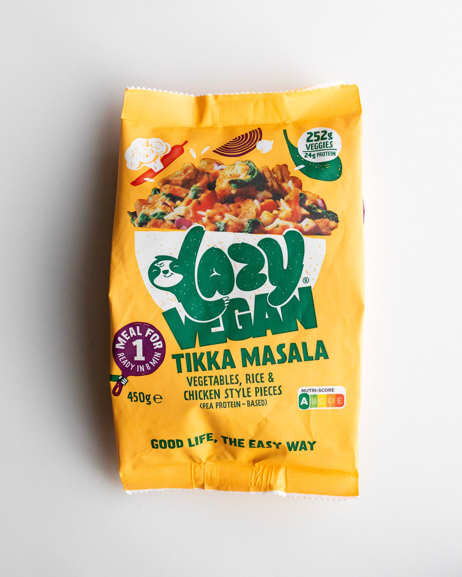 Soðin hvít hrísgrjón 25% (vatn, hrísgrjón), tómatar 15%, plöntubitar 11% (vatn, ertuprótein 3%, repjuolía, ertuþráður, sterkja, sólblómaolía, salt), blómkál 10%, kjúklingabaunir 8%, gulrætur 7%, spínat 7%, rauðlaukur 4%, kókosmjólk 4% (kókosþykkni, vatn), kókosolía, hvítlaukur, engifer, rauður chili, kóríander, repjuolía, kókosflögur, kóríanderduft, túrmerik, sinnepsfræ, fenugreek, kúmen, salt, kanill, svartur pipar, kardimomma, cayennepipar, fennel.