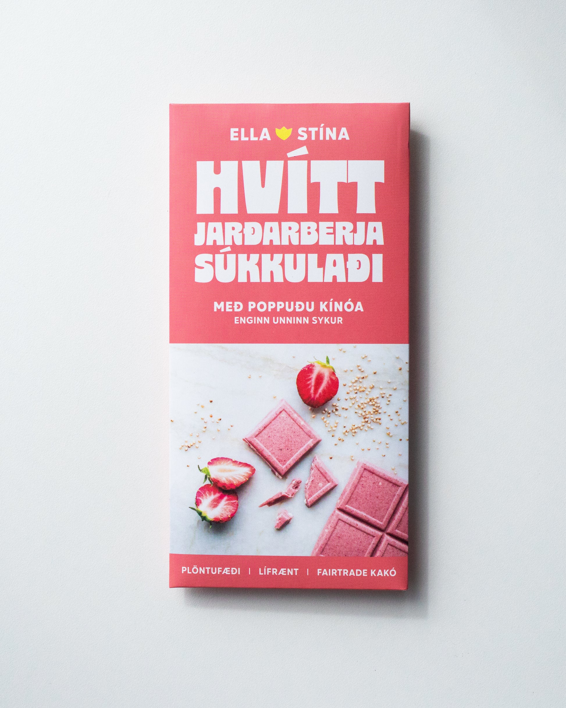 Hrásykur, kakósmjör, tígrishnetumjöl, kókkosrjómi, frostþurrkuð jarðaber(4%), poppað kínóa(3%), ýruefni(sólblómalesitín). Kakó(35% lágmark) úr lífrænum landbúnaði.